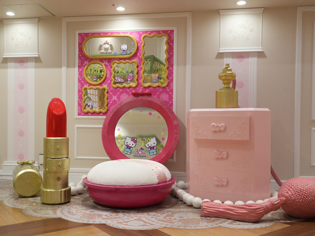 イベント期間中は、35周年限定デザインのフォトスポットが館内各所に登場します。なかでも注目は、レディキティハウスやKiki&Lala トゥインクリングスタジオなど、様々な場所に設置される「秘宝の鏡」をモチーフにしたフォトスポットです。35周年にちなみ、全35キャラクターが描かれたキュートなフレームの鏡が設置され、キャラクターたちと一緒に“笑顔”のミラーセルフィーを撮ることが出来ます。
