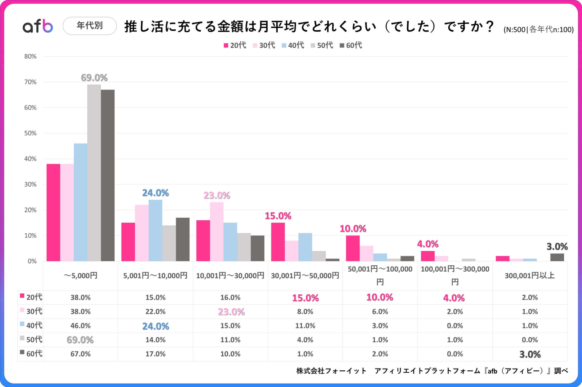 アフィリエイトプラットフォーム「afb(アフィビー)」の開発運用を行う株式会社フォーイットは、全国の20代~60代までの男女500人を対象に「推し活」に関するアンケートを実施、年代別等の特徴について、その結果を発表しました(調査実施日:2025年6月19日)。