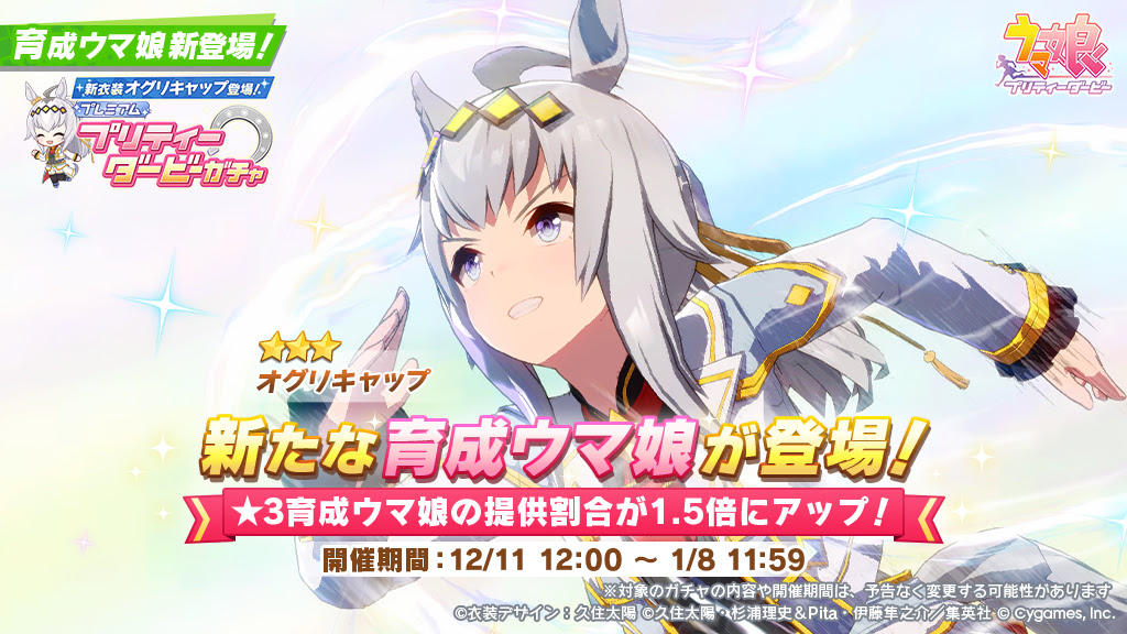 ゲーム『ウマ娘 プリティーダービー』の育成ウマ娘として、新衣装のオグリキャップが登場! またあわせて、「イナリワン登場! ピックアップサポートカードガチャ」もスタートしました。