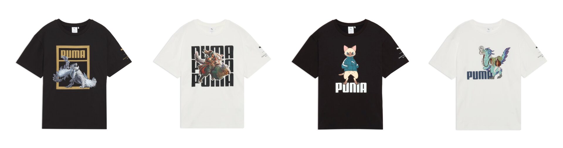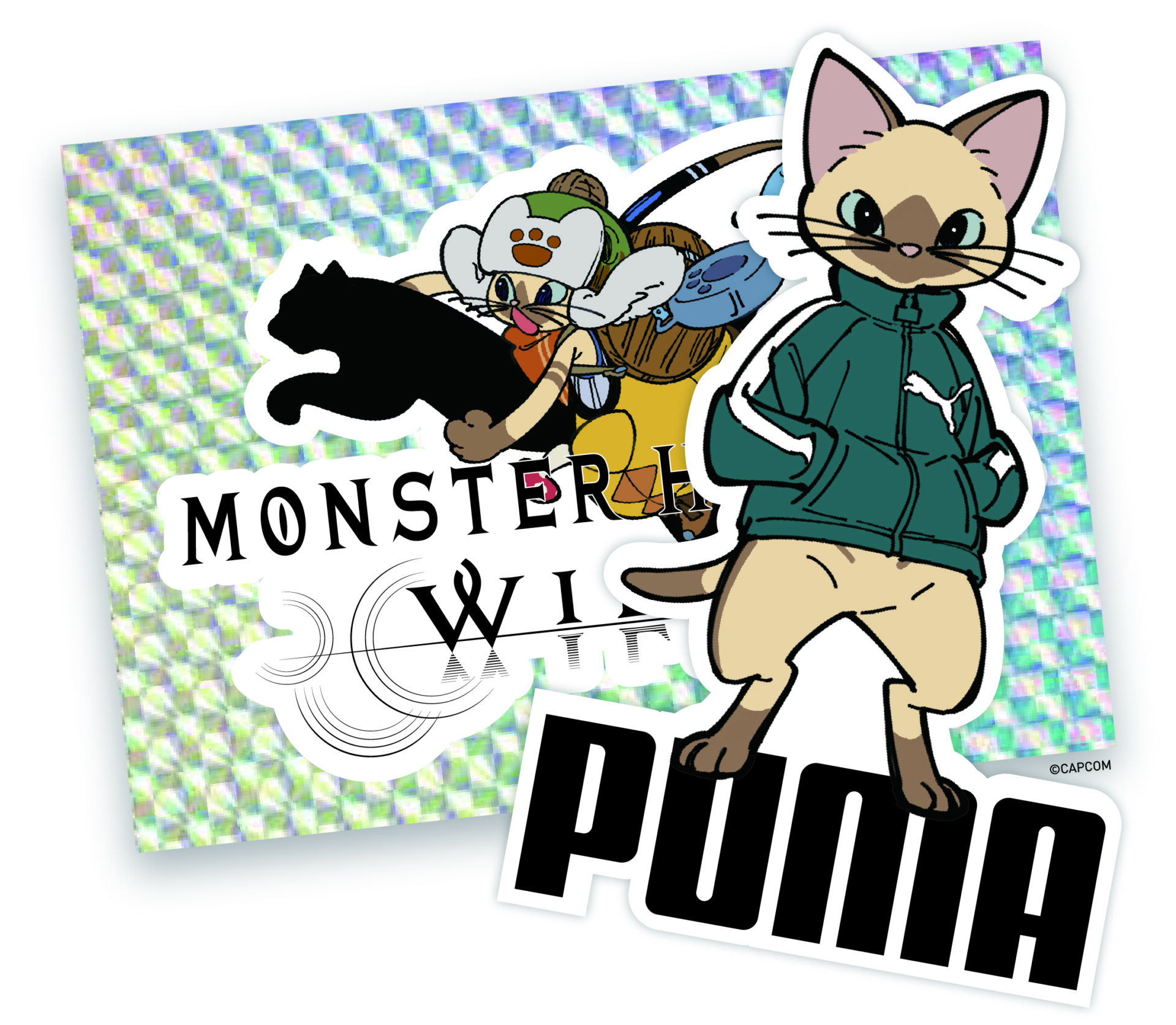 プーマを象徴するトラックジャケット“T7”を着用した今回限定描き下ろしのアイルーをデザインしたTシャツや、プーマキャットの上に乗ったアイルーをあしらったフーディーなど、特別仕様のアイテムがラインナップしています。