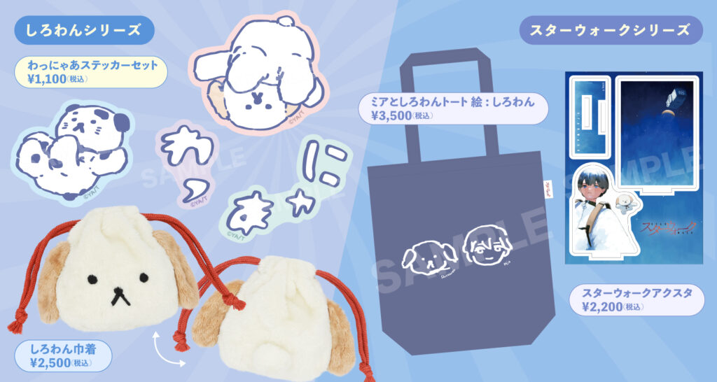 カバーイラストのアクスタや、しろわんが描いた、ミアとしろわんの絵をプリントしたトートバッグも販売いたします!