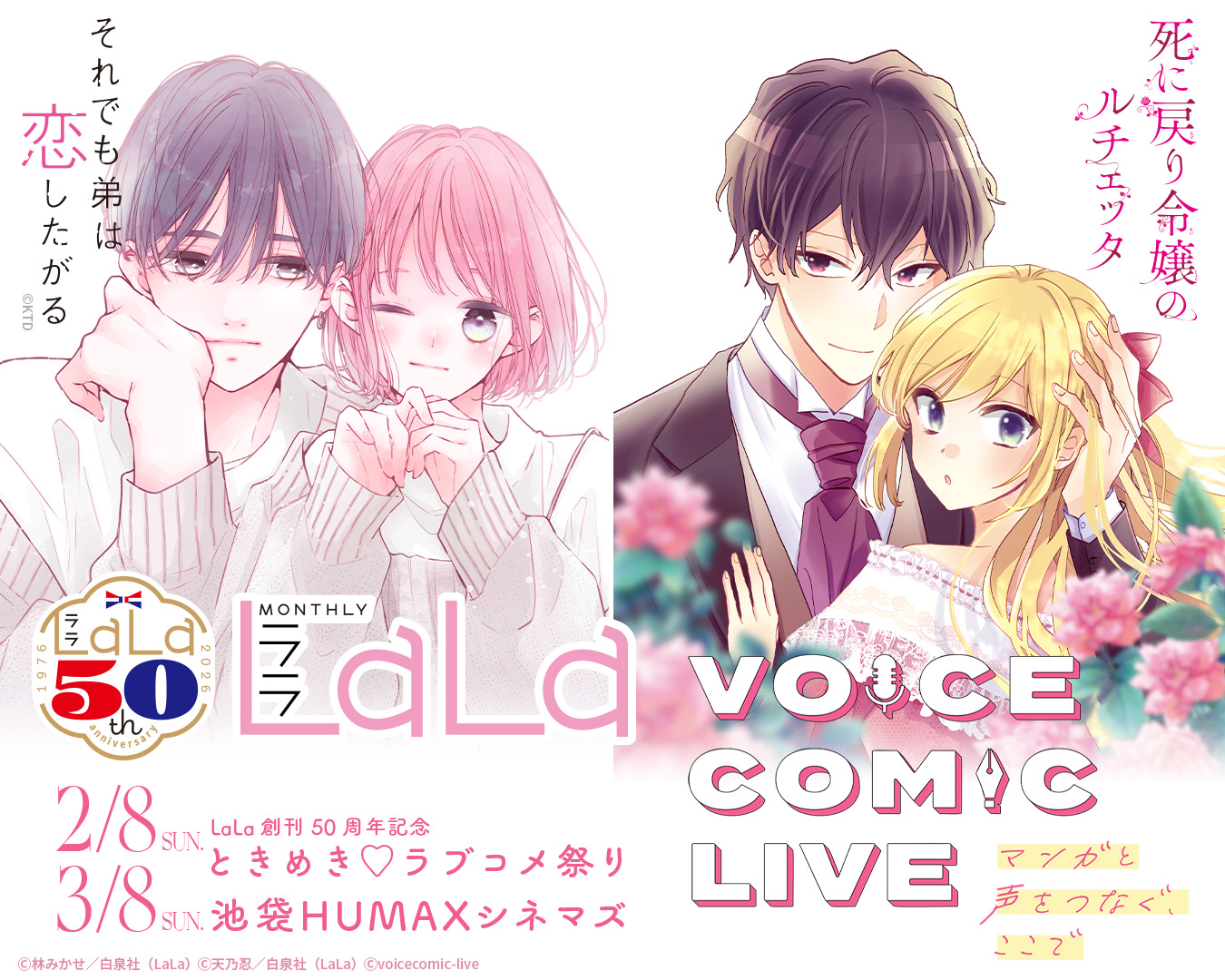 白泉社の「LaLa」創刊50周年記念公演として、2026年2月8日(日)、3月8日(日)に池袋HUMAXシネマズで開催されるボイスコミックライブ「ときめき♡ラブコメ祭り」。