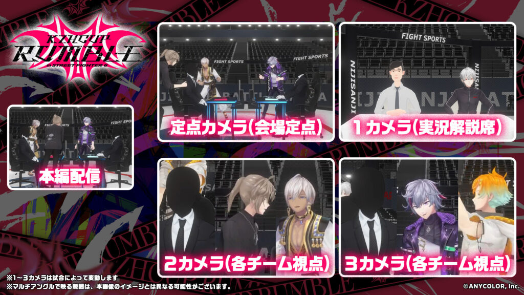 決勝戦/エキシビションマッチはABEMA(アベマ)で全編無料放送。「マルチアングル付き視聴チケット」では通常の本編配信に加え、決勝戦では「会場定点」「2チーム各視点」「実況解説席」、エキシビションマッチでは「会場定点」「チーム葛葉で2視点」「チームストリーマー視点」の本編配信を含めて5つの視点を切り替えながら楽しめます。