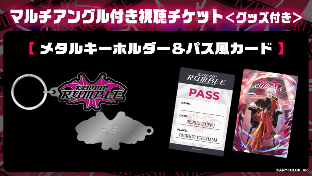 ・マルチアングル付き視聴チケット〈グッズ付き〉:グッズはメタルキーホルダー&パス風カードとなります。