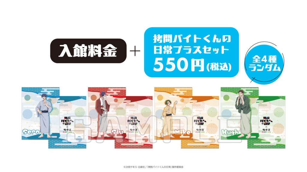 店舗ご入館時に、入館料金+拷問バイトくんの日常プラスセットの料金をお支払いいただいた方に、描き下ろしイラストを使用したコラボ限定クリアファイルをランダムでお渡しします。