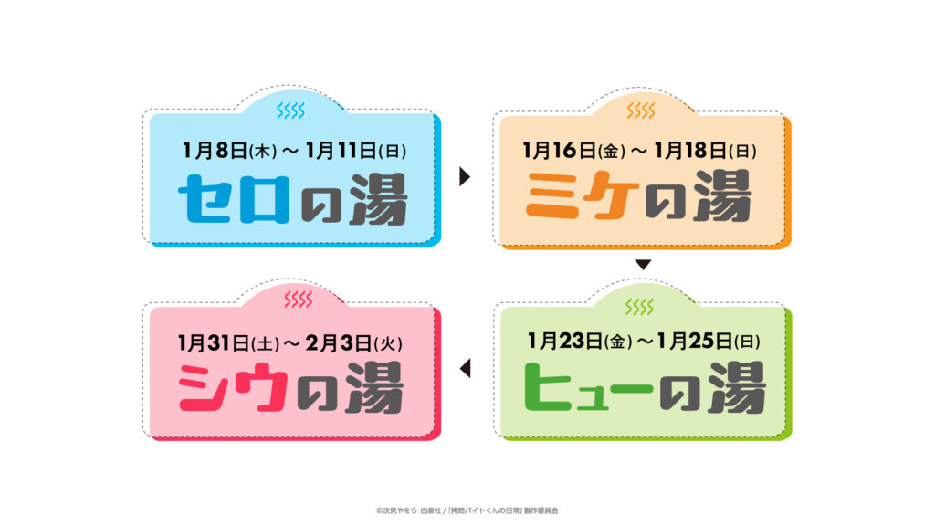2026年1月8日(木)より極楽湯 多摩センター店でスタートするTVアニメ『拷問バイトくんの日常』×極楽湯コラボキャンペーン。“スピリタスのごくらく慰安旅行”をテーマにしているそうなので、、4人のバイトくんたちとともに癒しのコラボ空間を堪能してみてはいかがでしょうか?