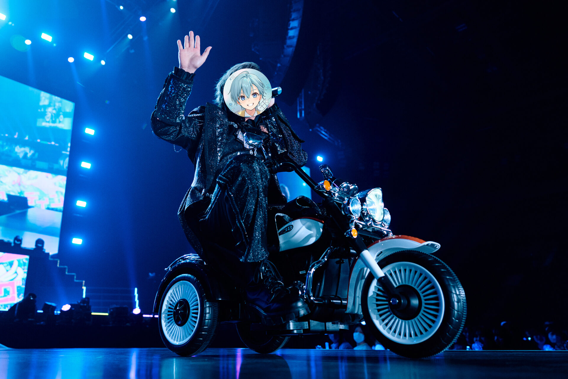 穏やかでアンバーな光を放つ球体ランプに囲まれ花道で揺蕩うようにていねいに歌声を響かせた「心像」。一転、球体ランプがカラフルに光り、ダンサーと軽やかに楽しげに歌って踊ってTikTok風映像演出でも盛り上げた「チョロすぎ?」。「空色エンドロール」という作品の幅と奥行きを感じさせたあとは、ころんがブルーとシルバーのラメが光るショートジャケットを羽織り、DJタイムへ突入。そのままなだれ込んだすとぷりの「パンピじゃないのよッ!!」から連なった「きゅんですきゅんです」、「タイフーン・ビート」、すとぷりの「白馬のオールナイト」では、レコードをかたどった電飾きらめくフロートに乗り込んでアリーナ客席通路を進むころんが、たっぷりファンサをしたり、タオルをぐるんぐるん振り回したり、リスナーの全力コールを浴びたり。さらにたたみかけた「唱」では、エキゾチックビートを完璧に乗りこなす歌とダンスで覇者の風格を漂わせたり。ころんという沼は、とんでもなく深い。