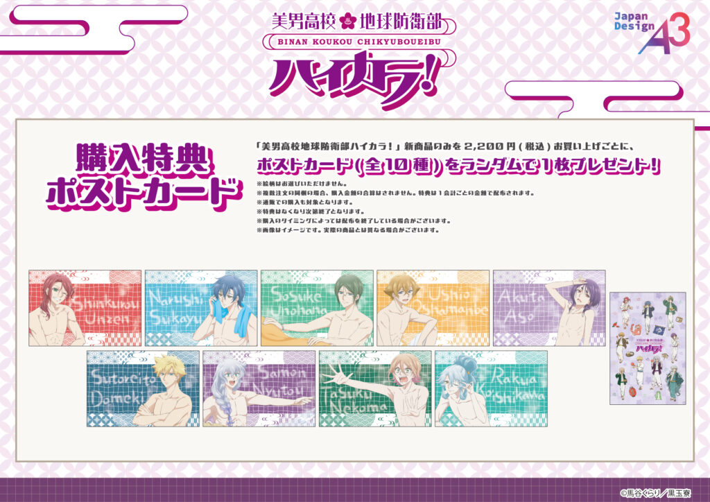 『美男高校地球防衛部ハイカラ!』新商品のみを1会計2,200円(税込)お買い上げごとに、購入特典としてポストカード(全10種)をランダムで1枚プレゼント。