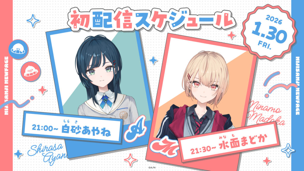 今回デビューしたのは、白砂あやねさんと水面まどかさんの女子高生の親友コンビで、「うみゃみー」というユニットとして活動予定の2人。本日1月30日(金)21:00からリレー形式で初配信が行われます。