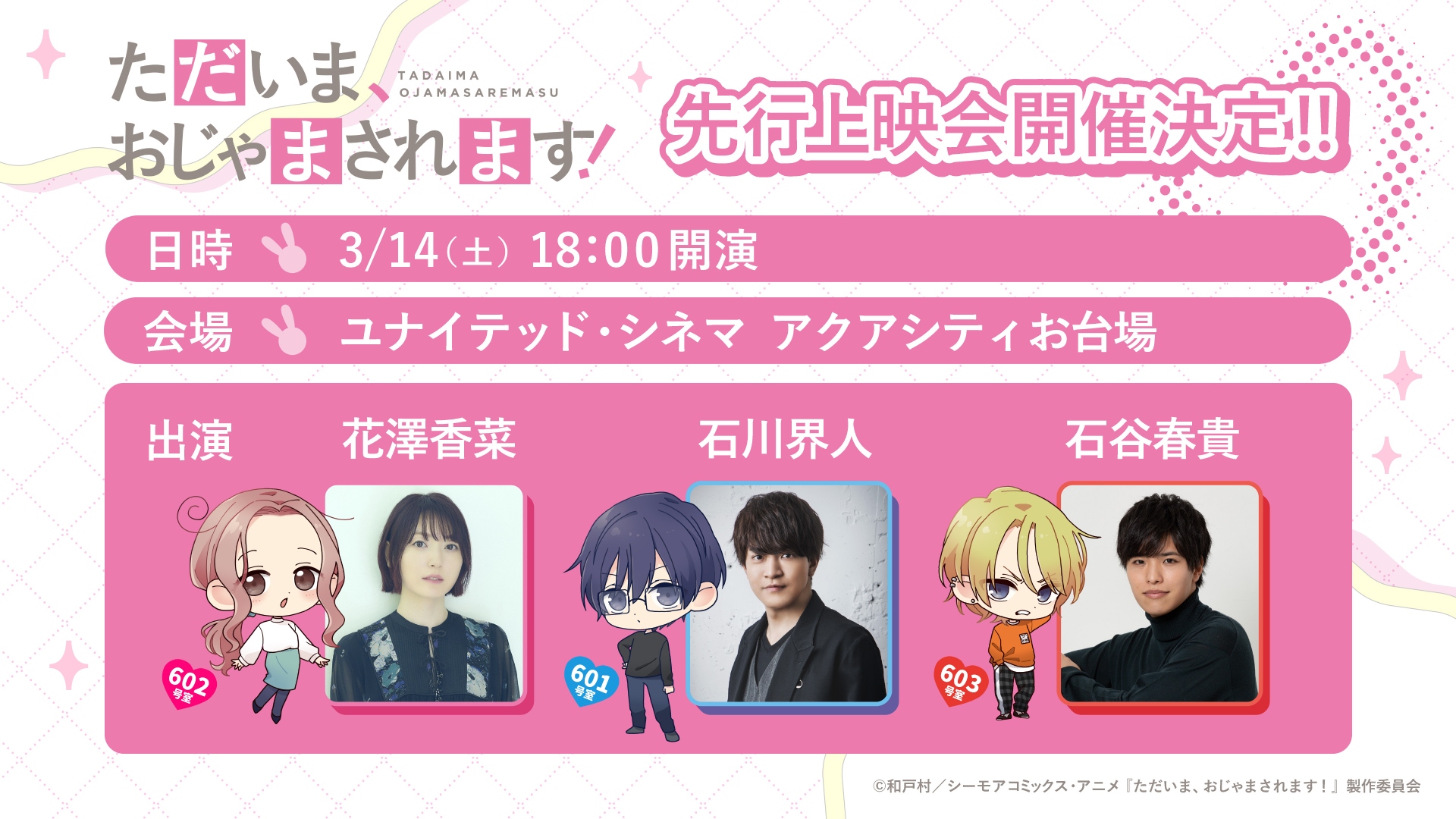2026年4月より放送予定のTVアニメ『ただいま、おじゃまされます!』は、「コミックシーモア」で配信中の人気オリジナルコミックが原作。4月からの放送に先駆けて、キャスト陣が登壇する第1話先行上映会の開催が決定しました。