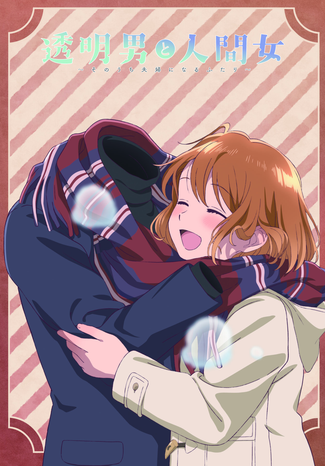 TVアニメ『透明男と人間女』の第2弾キービジュアルには、一つのマフラーを二人で巻き、笑顔で抱き合う冬の装いをした透乃眼あきらと夜香しずかの姿が。二人の間に確かな暖かさと絆が感じられるビジュアルになっています。