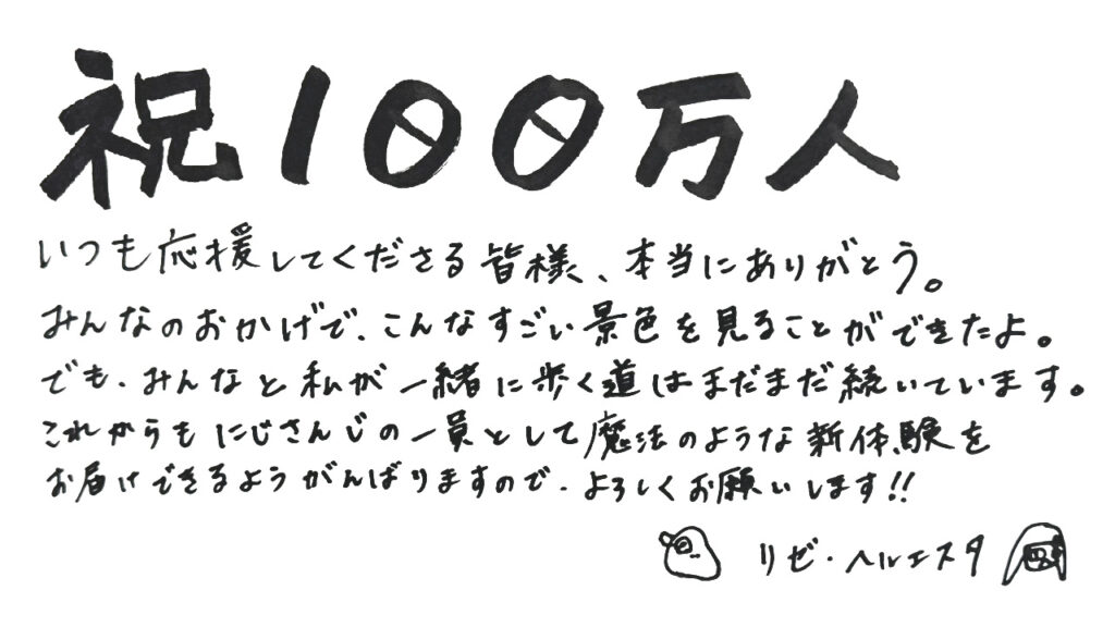 そんななか、YouTubeチャンネル登録者数が100万人を突破! 登録者数100万人突破にあたり、記念動画とリゼさん直筆のコメントが公開されました。