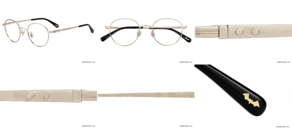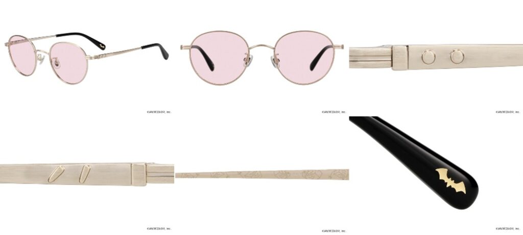葛葉が身に着けているピアスのイメージを、テンプルのメタルパーツで表現。ヨロイ部分はジャージのラインをモチーフにデザイン。テンプルエンドには、モチーフであるコウモリをあしらいました。テンプル裏側には、メガネをかけた“へーベル石田”が登場。サングラスのカラーレンズには、メガネのモデルに合わせたこだわりのカラーを採用!