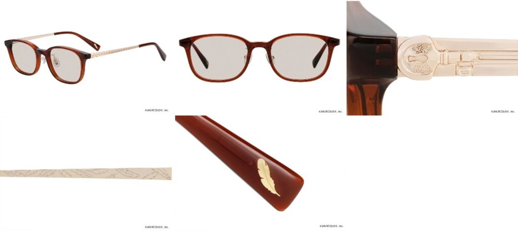 ローレン・イロアスが身に着けているネックレスの鍵を、テンプルにメタルパーツで再現。テンプルに施した2本ラインは、彼の衣装をイメージ。テンプルエンドのインレットとテンプル裏側には、モチーフである羽をあしらいました。サングラスのカラーレンズには、メガネのモデルに合わせたこだわりのカラーを採用!