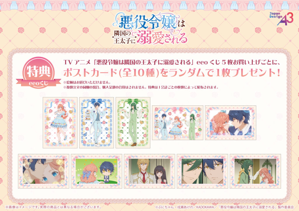 TVアニメ『悪役令嬢は隣国の王太子に溺愛される』の「eeoくじ」を1会計5枚お買い上げごとに、購入特典としてポストカード(全10種)をランダムで1枚プレゼント。ここでしか手に入らない限定品ですので、ぜひコンプリートを目指して集めてみてください!