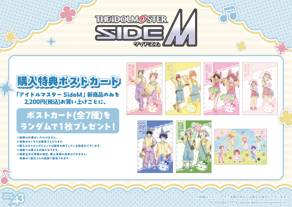 『アイドルマスターSideM』の新商品のみを1会計2,200円(税込)お買い上げごとに、購入特典としてポストカード(全7種)を1枚プレゼントします♪