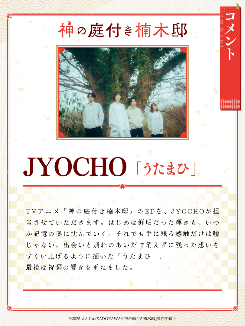 さらに本作のED(エンディング)テーマが、京都発のプログレッシブ・ロックバンド“JYOCHO”による「うたまひ」に決定。これにあわせて、JYOCHO・だいじろーさんからのスペシャルコメントも公開されています!