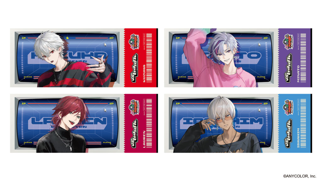 ※せめ4(葛葉/不破湊/ローレン・イロアス/イブラヒム)グッズをご購入の方には3,000円(税込)毎に「チケット風カード せめよん ver.(全4種)」を、VOLTACTIONグッズをご購入の方には3,000円(税込)毎に「チケット風カード VOLTACTION ver.(全4種)」をお渡しいたします。
