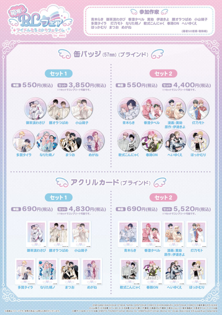「箱推しBLフェア~アイドルたちとのカフェタイム~ by eeo」の新商品のみを1会計2,200円(税込)お買い上げごとに、ポストカード(全15種)を購入特典としてランダムで1枚プレゼントいたします。