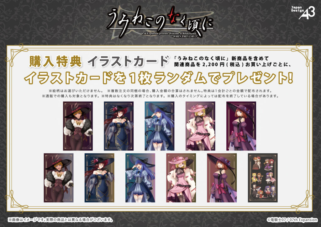『うみねこのなく頃に』の新商品を含む関連商品を1会計2,200円(税込)お買い上げごとに、購入特典としてポストカード(全11種)をランダムで1枚プレゼント!