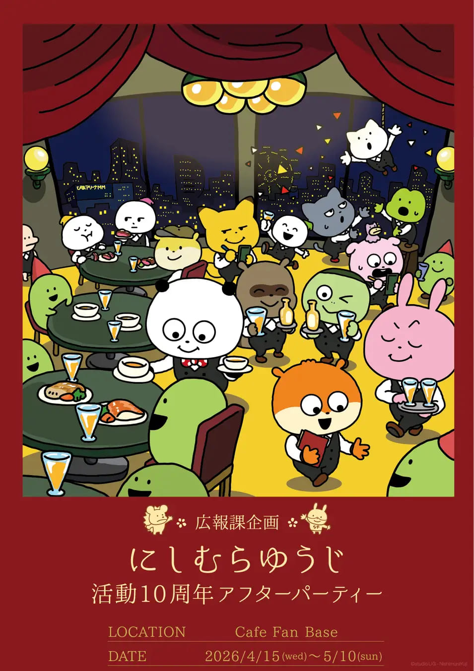 横浜・みなとみらい、ランドマークプラザ5階にある「Cafe Fan Base(カフェ ファンベース)」にて、コラボカフェ「広報課企画 にしむらゆうじ活動10周年 アフターパーティー」が、2026年4月15日(水)~5月10日(日)の期間限定での開催が決定!