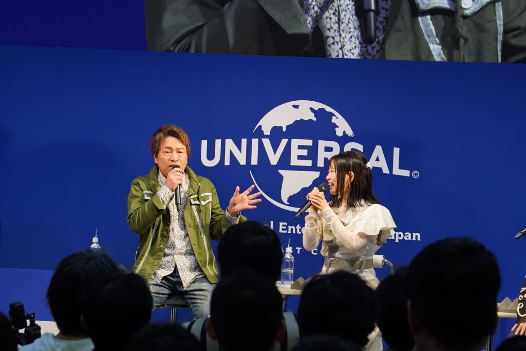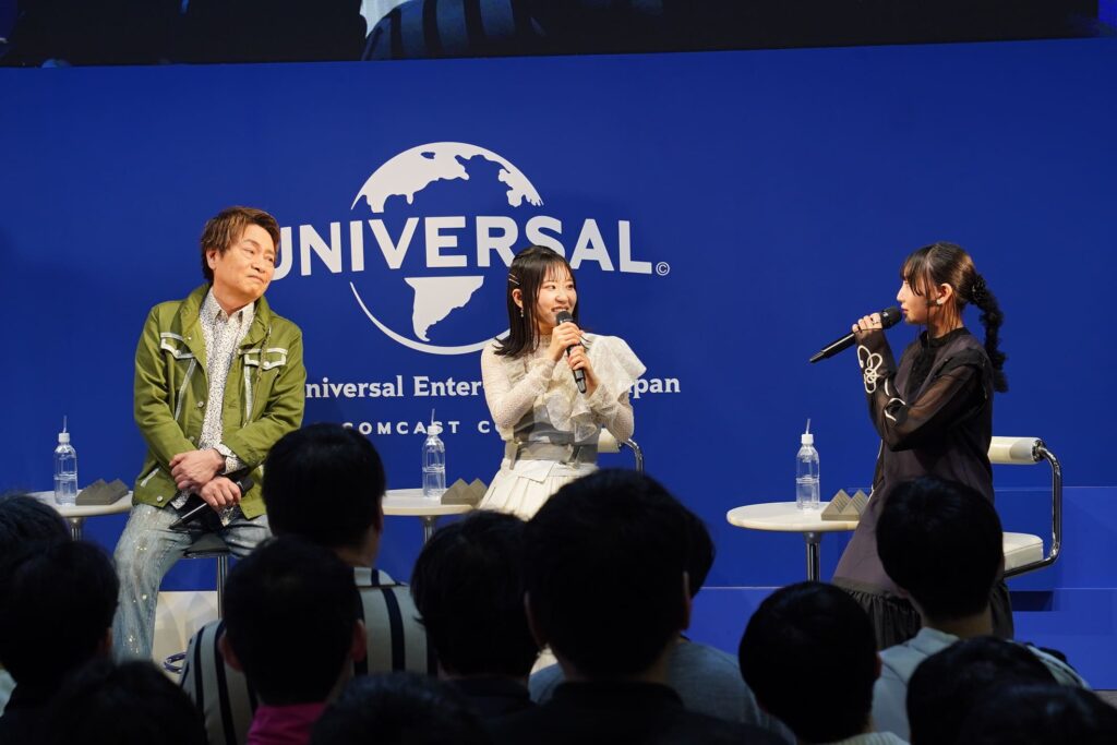 背後のスクリーンにベリルの姿が映し出されると、東山は「今のスライド、もう一度見せてもらっていいですか…!?」と大興奮。師匠であるベリルがカッコよすぎると声を弾ませ、「稽古着のベリル先生も、護衛任務の正装姿の先生もカッコいい。本当に、いつでも先生はカッコいい。まっすぐで謙虚で、ステキだなぁとうっとりする」と愛情爆発。「平田さんがベリル先生に見えてしまうこともあるので、アリューシアを演じやすい。平田さんも謙虚で、いつでも弟子たちを愛情深く見てくれている」と平田への尊敬をにじませながら演じていると話し、矢野も「私も、正装姿のベリル先生が好き」と目尻を下げた。