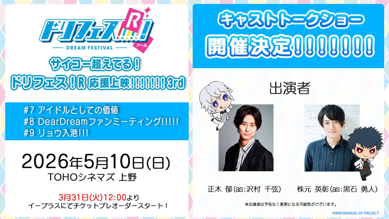 5次元(2次元+3次元)アイドル応援プロジェクト「ドリフェス!シリーズ」の応援上映第3弾「サイコー超えてる!ドリフェス!R 応援上映!!!!!!! 3rd」が、2026年5月10日(日)にTOHOシネマズ 上野で開催決定!