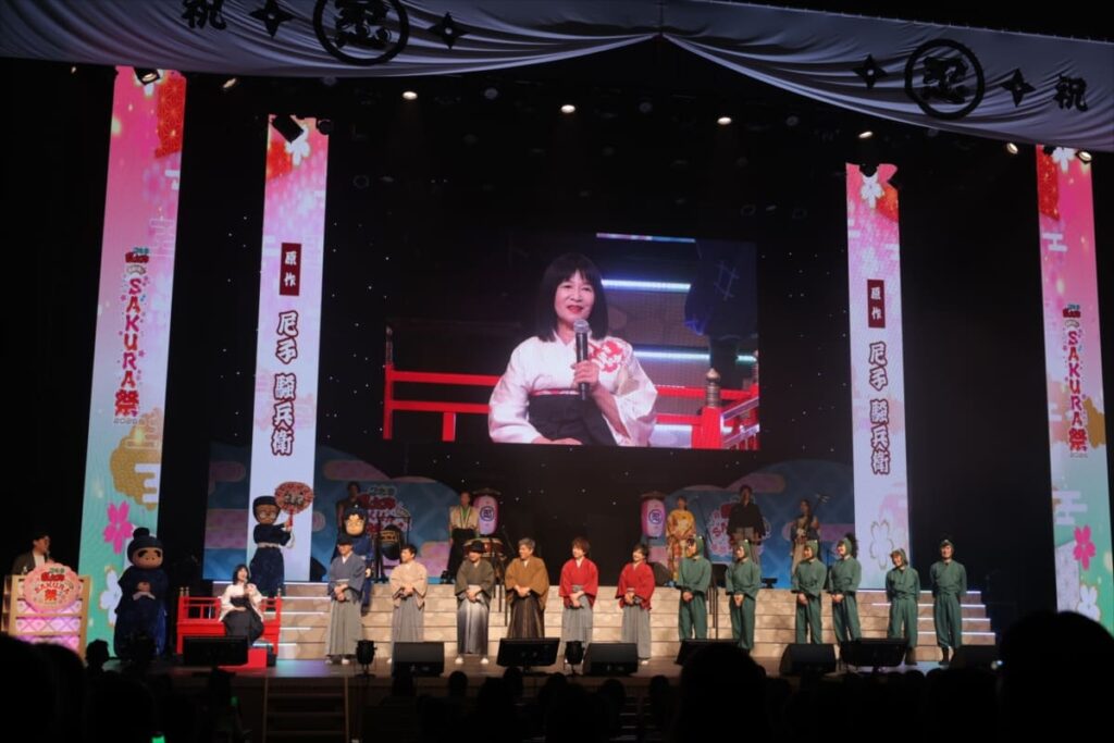 続いて、原作40周年のセレモニーにふさわしい和楽器の音色が会場内に響き渡ると、原作者の尼子騒兵衛が盛大な拍手とともにステージに登壇。この日のために用意された特製の法被をまとったキャスト陣と、会場が心をひとつにし、大きな節目を祝うにふさわしい三本締めを行いました。尼子は「『落第忍者乱太郎』は、最初は3カ月だけの連載予定だったのですが、もうちょっと続けませんか? と言っていただき、そこから気付いたら40年経っていました」と、人生何があるか分からないと当時を振り返りつつ、「人生続いていけば何かいいことあるよっていう希望を感じられる、この先も希望をもって進んでいけたら」と朗らかな笑顔を見せました。