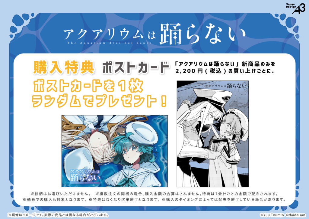 コミカライズ『アクアリウムは踊らない』新商品のみ2,200円(税込)お買い上げごとに、数量限定ポストカード(全2種)を1枚プレゼント。