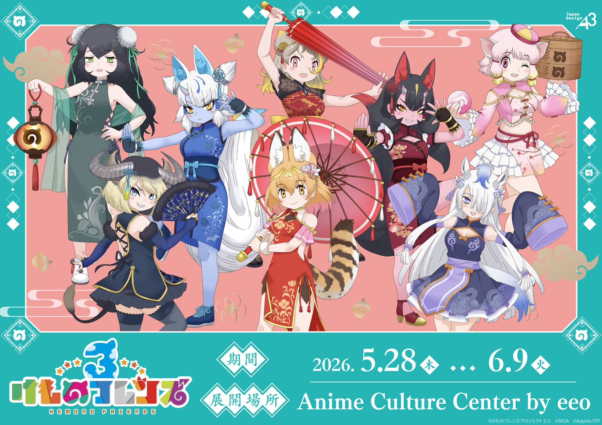 新作グッズには、チャイナ服がテーマの描き下ろしイラスト&POP Artを使用。どちらもチャイナ服に着替えたフレンズたちが可愛いイラストです♪
