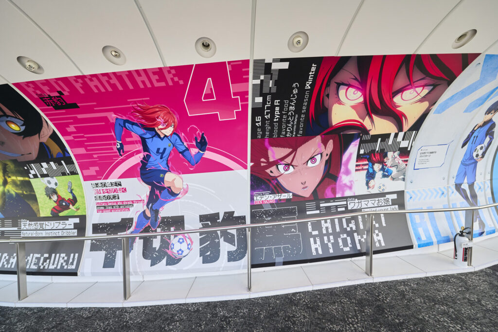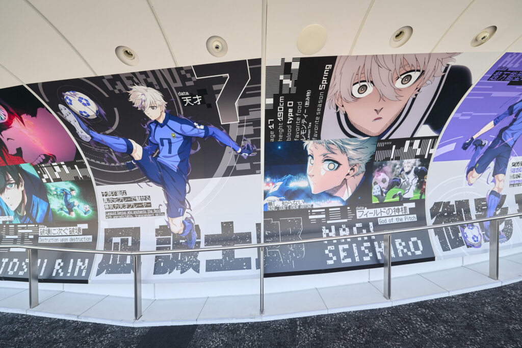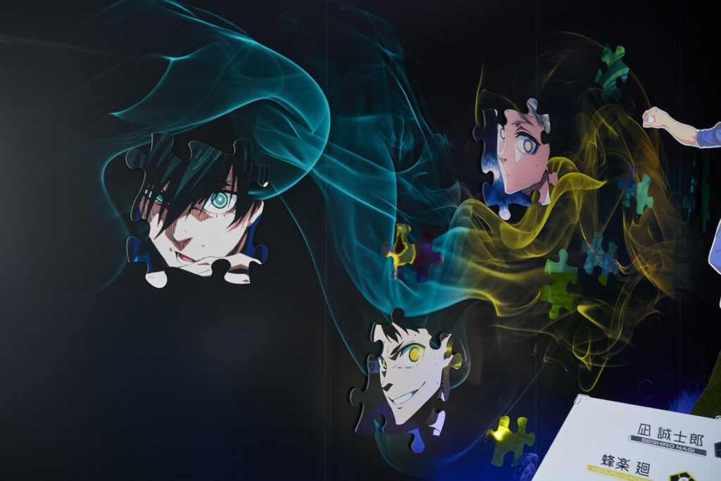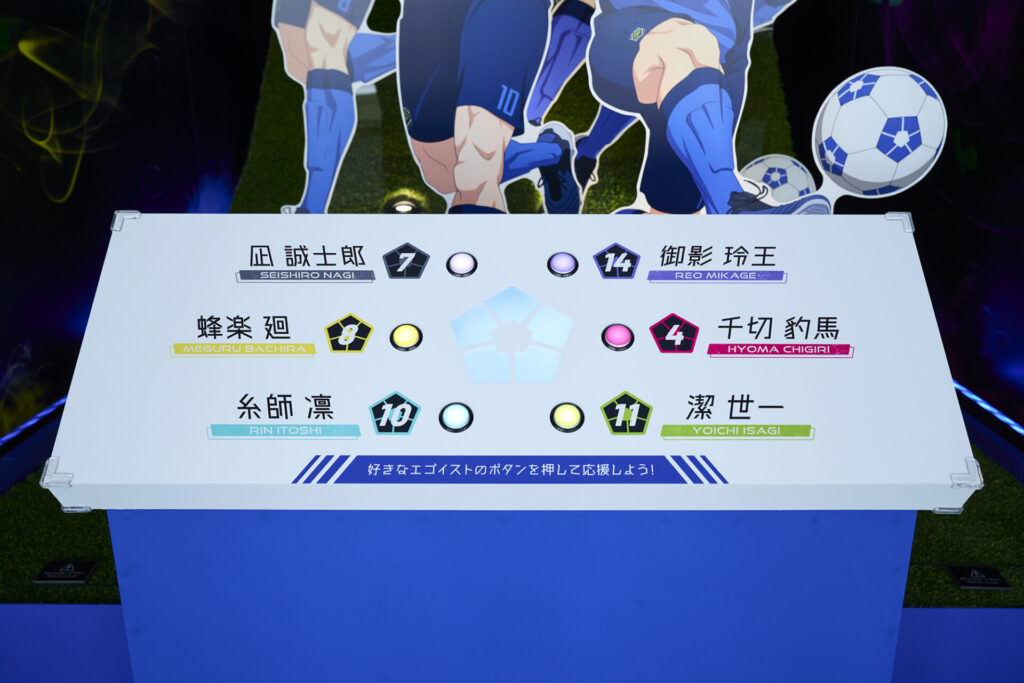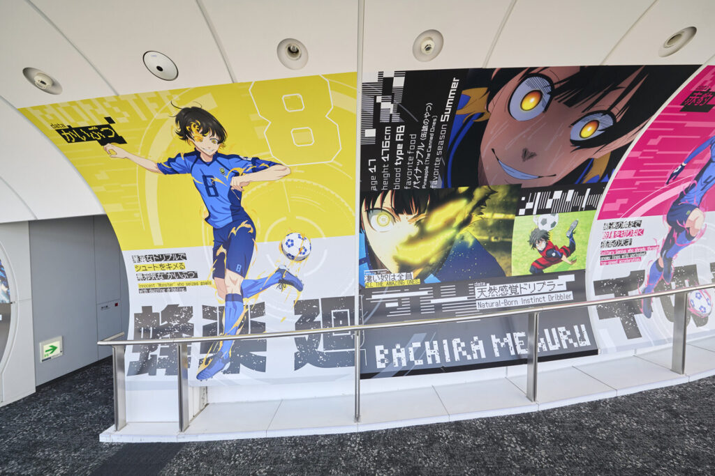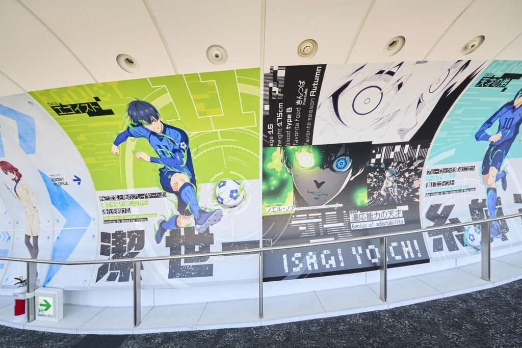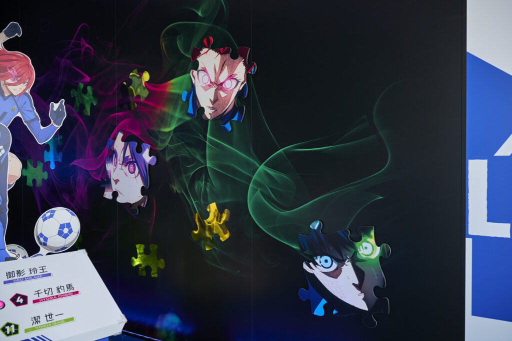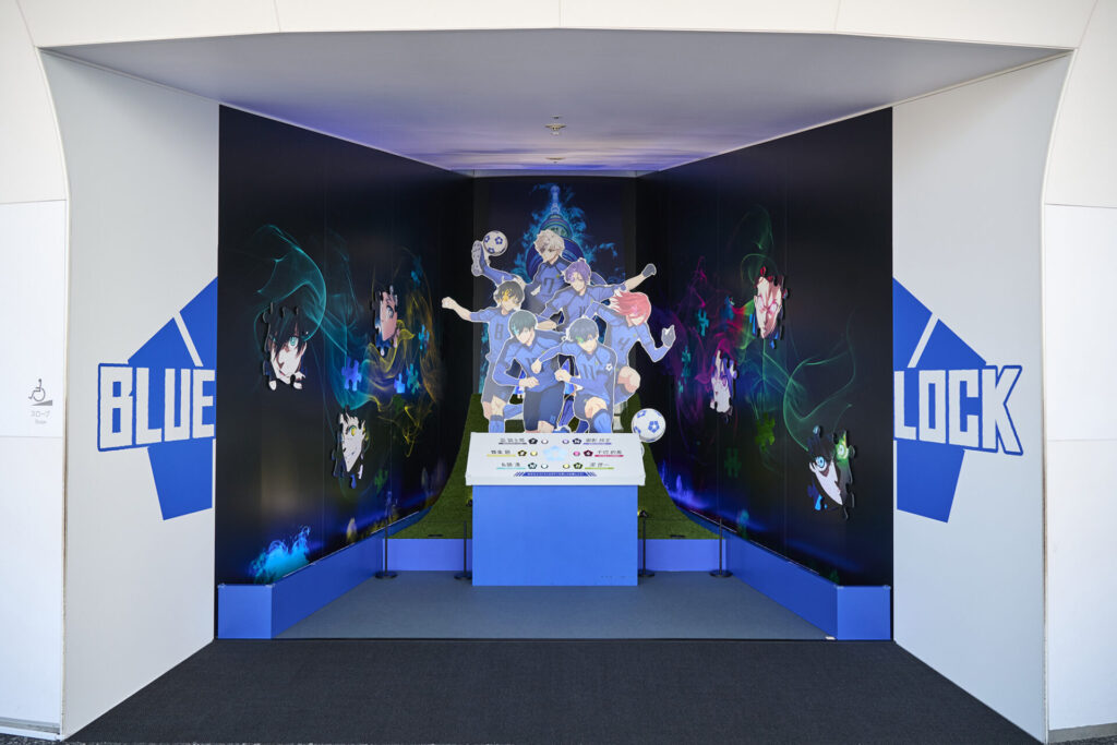 前半ではキャラクターや『ブルーロック』プロジェクトの軌跡を紹介しています。『ブルーロック』らしい背景のフォトスポットも含まれています。