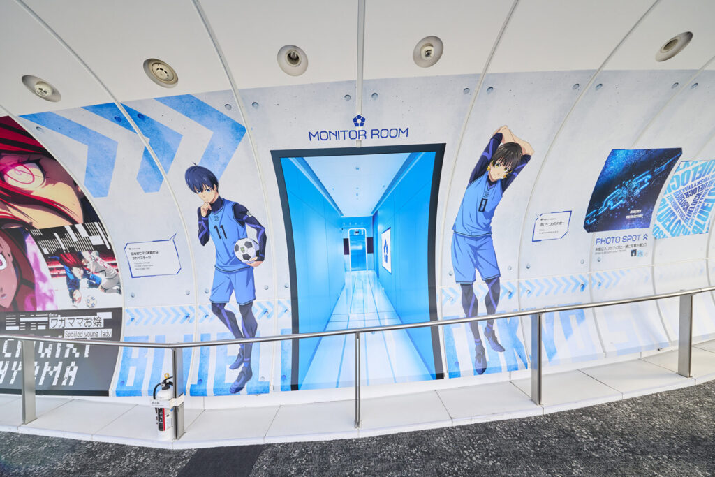 ブルーロック施設内の廊下、トライアウトフィールド(練習場)、ブルーロック施設外観をイメージしたフォトスポットです。