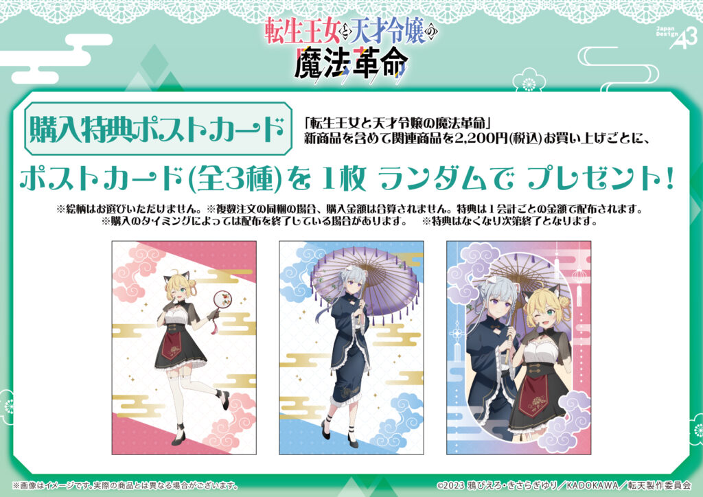 TVアニメ『転生王女と天才令嬢の魔法革命』の新作グッズを含む関連商品を、1会計で2,200円(税込)お買い上げごとに、ポストカード(全3種)をランダムで1枚プレゼントします。