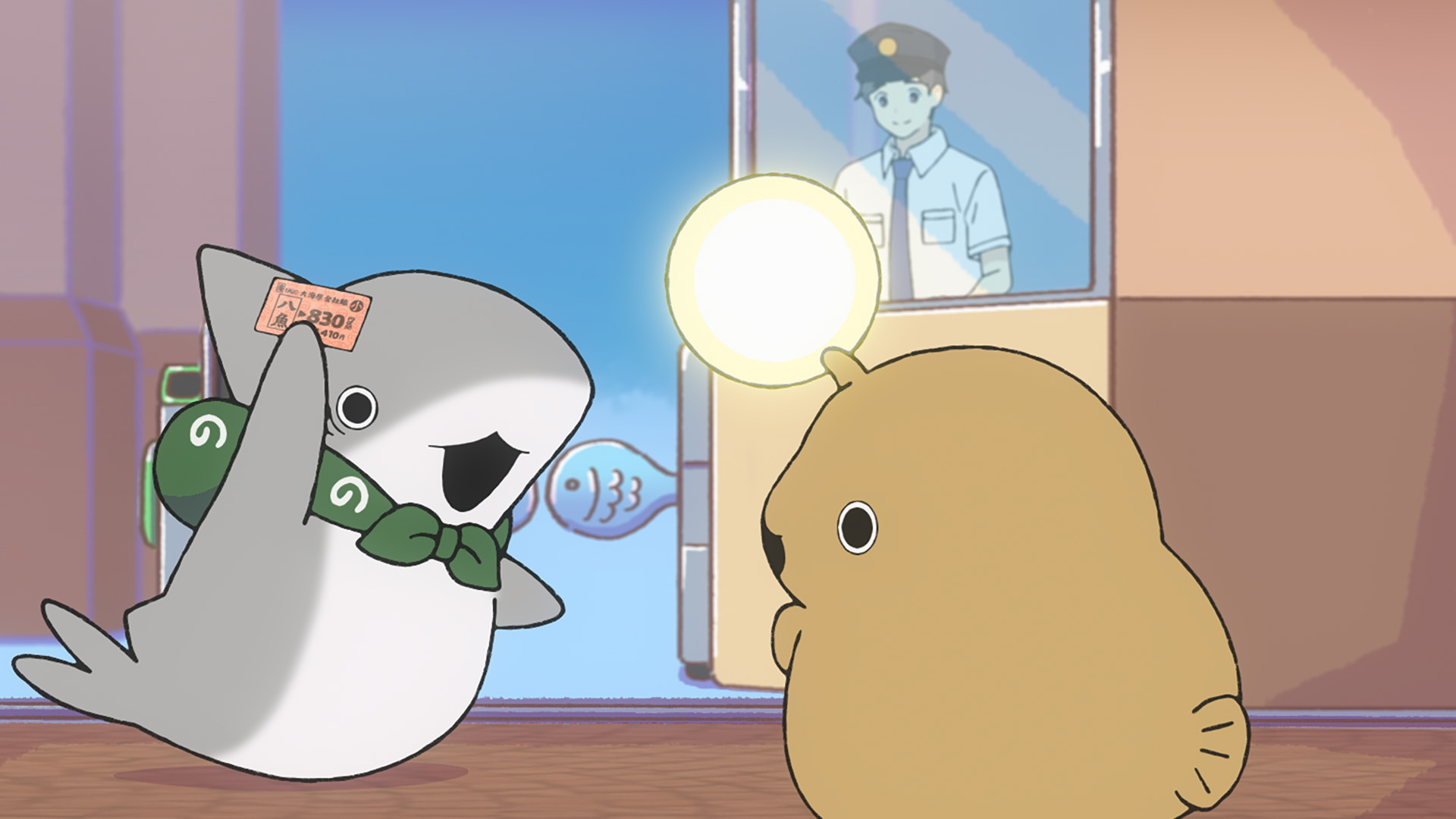 子ザメちゃんとあんこうちゃんは八魚駅から一緒にとかいへおでかけ。渋魚に到着した子ザメちゃんに、紳士なおじさんがポチ公口についてたずねてくる。