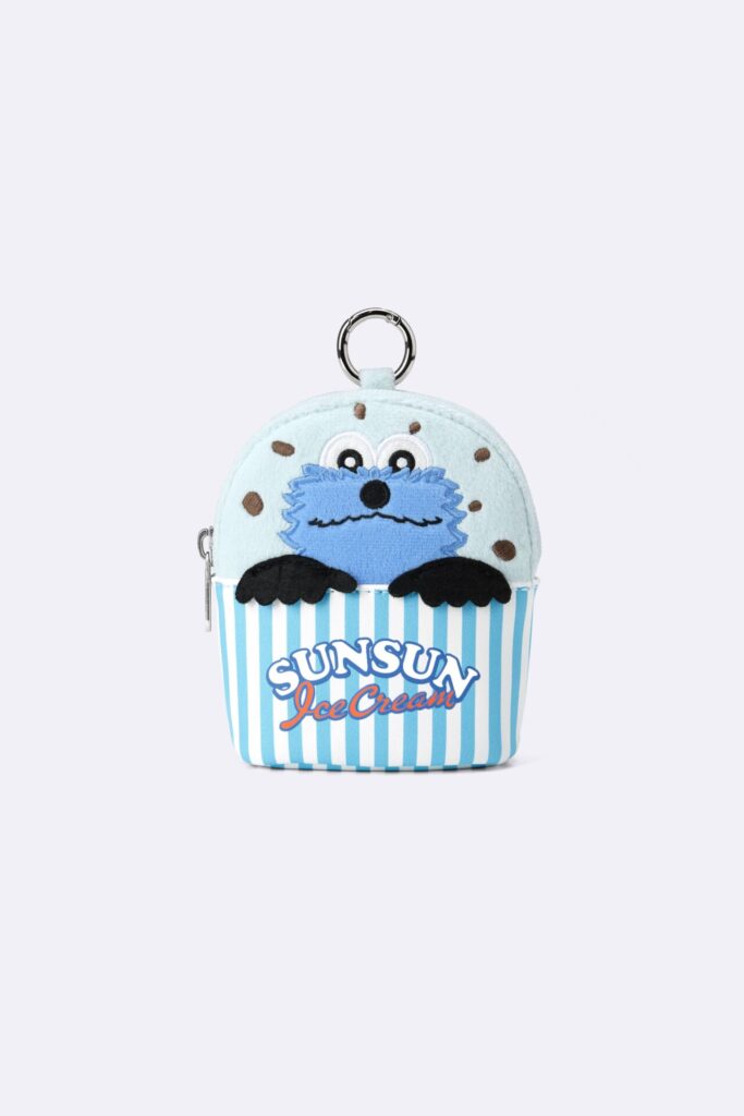 ラインナップには、アイスクリームショップワゴンやメニュー表などがデザインされたグラフィックTシャツや、アイスのフレーバーをイメージしたコットンパジャマなどのアイテムが勢ぞろい。さらに、スンスンがチョコミントアイスから、ノンノンがバニラアイスから顔を出すデザインのミニポーチなども登場します。