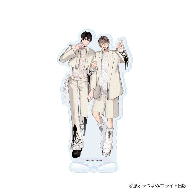 “アイドル”をテーマにした描き下ろしイラストでは、白を基調としたアイドル風衣装に身を包んだ推しカプの姿が♪ 本記事では、腰オラつばめ先生が手掛ける『俺たちナマモノ?です』(B.Pilz COMICS/ブライト出版 刊)のグッズラインナップや、先生からの直筆コメントをご紹介します。