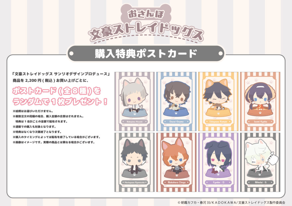 通販、または店頭で『文豪ストレイドッグス』サンリオデザインプロデュースグッズを1会計で2,200円(税込)お買い上げごとに、ポストカード(全8種)をランダムで1枚プレゼントします。