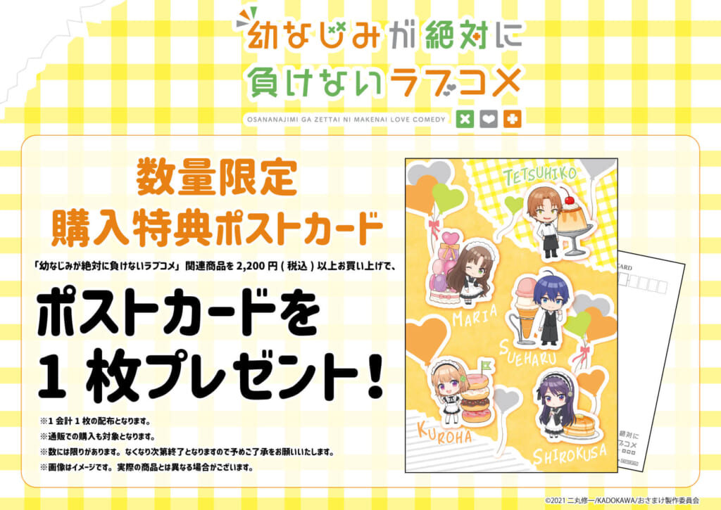 『幼なじみが絶対に負けないラブコメ』関連商品を2,200円(税込み)以上お買い上げで、ポストカードを1枚プレゼント。