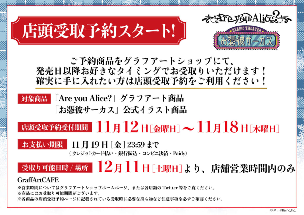「Are you Alice?」「お憑彼サーカス」いずれかの新商品を含め、関連商品を2,200円(税込)お買い上げごとに、特典ポストカード(全2種)を1枚ランダムでプレゼントいたします。