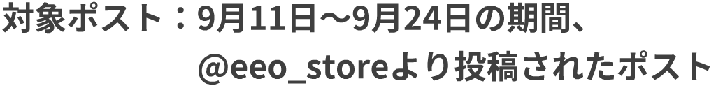 ・キャンペーンの対象ポストは2023年9月11日(月)〜9月24日(日)の期間に、eeo Store公式アカウント(@eeo_store)より投稿されるすべてのポストとなります。